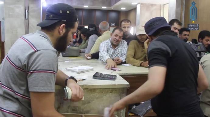 (الصورة من وكالة إباء التابعة لهيئة تحرير الشام في إدلب، تظهر تسليم القمح في مركز راعا، بشمال المحافظة)