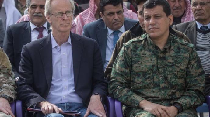 (الصورة: مسؤولون في الإدارة الذاتية الكردية في استقبال مسؤول أمريكي - أرشيفية)