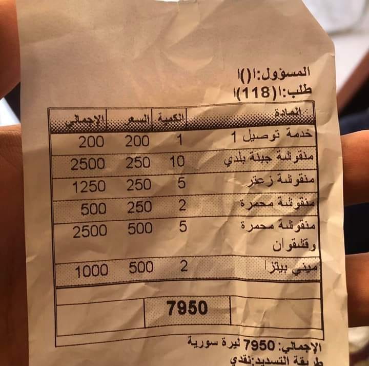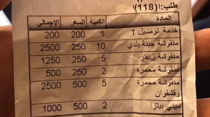 صفحة (دليلك في ضاحية قدسيا) نشرت فاتورة أحد محلات الفطائر في المدينة والتي عكست مدى الغلاء الذي وصلت إليه أسعارها، وجاءت التعليقات لتلعن الغلاء وأسبابه.