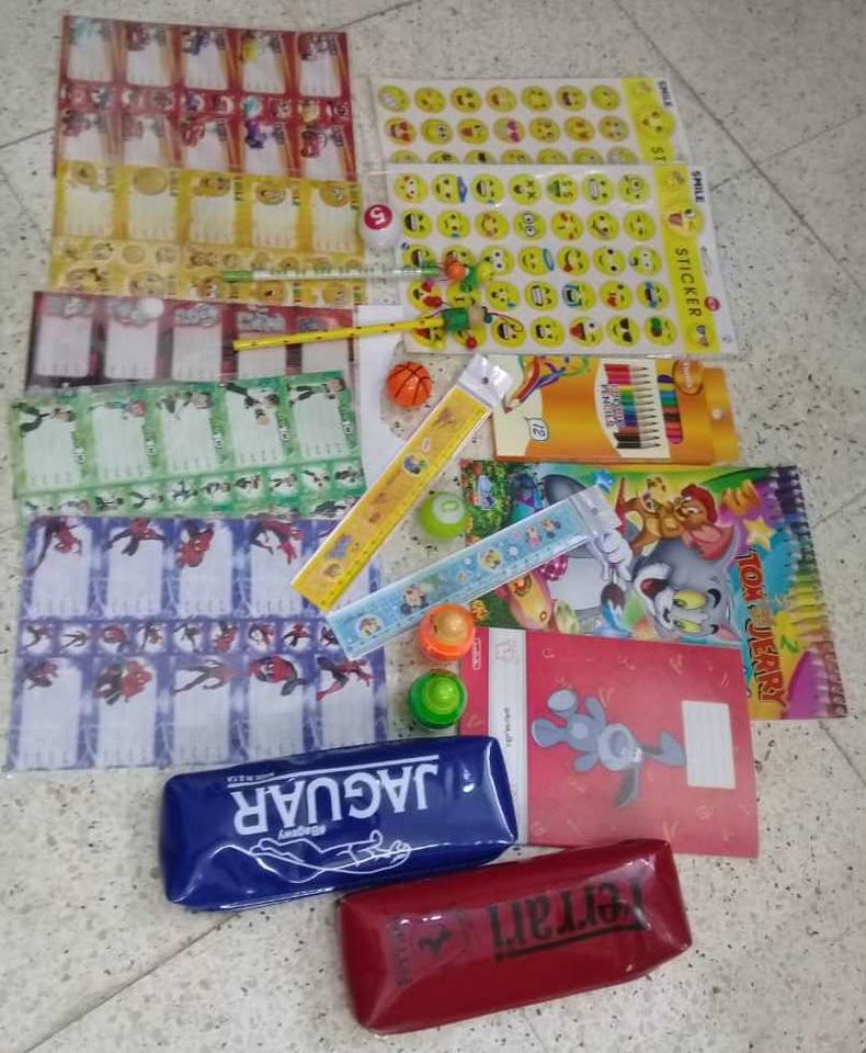 تتضمن الفاتورة أقلام رصاص وتلوين ومبراة وممحاة وصور سمايل واتكيت لاصق لكتابة اسم الطفل إضافة لدفتر رسم وآخر للكتابة (عربي).