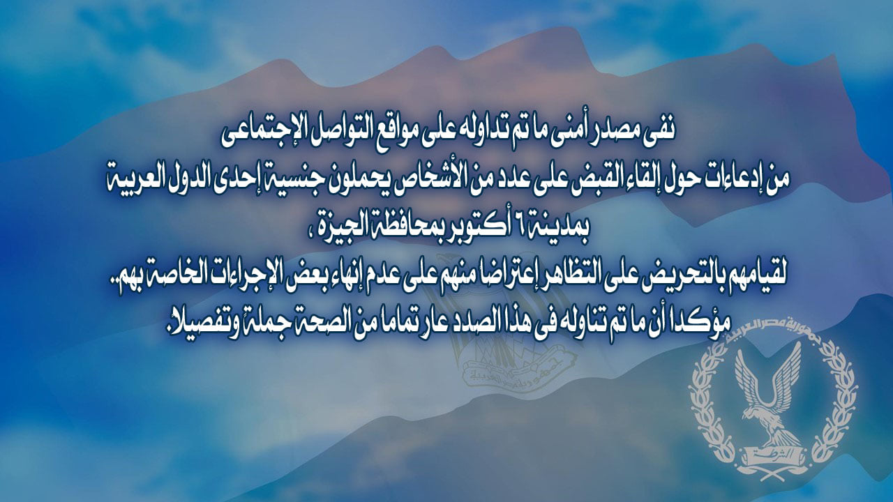 وأكد بيان الداخلية المصرية أن ما تم تناوله بهذا الصدد عارٍ تماماً عن الصحة جملةً وتفصيلاً.