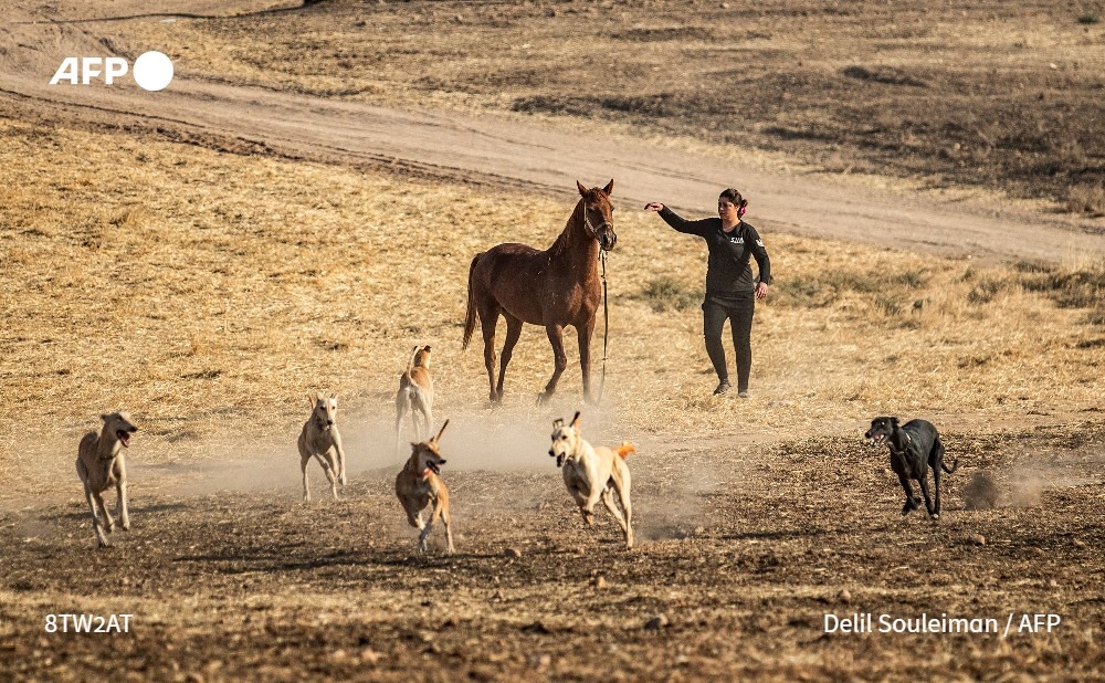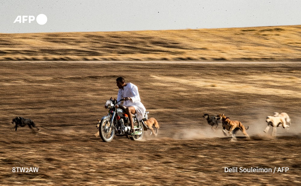 عند أطراف قريته في شمال شرق سوريا، يتجول محمد درباس على متن دراجته النارية محاطاً بكلاب نحيلة من فصيلة السلوقي اتخذ من تربيتها مهنة له... فلم يحل النزاع المستمر في بلاده ووباء كوفيد-19 دون بيعها للمشاركة في سباقات في دول الخليج.