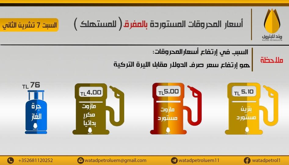 ومؤخراً، رفعت "وتد للبترول" أسعار المحروقات المستوردة ومنها مادة الديزل التي وصل سعر الليتر الواحد منها إلى 5 ليرة تركية.