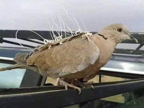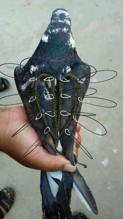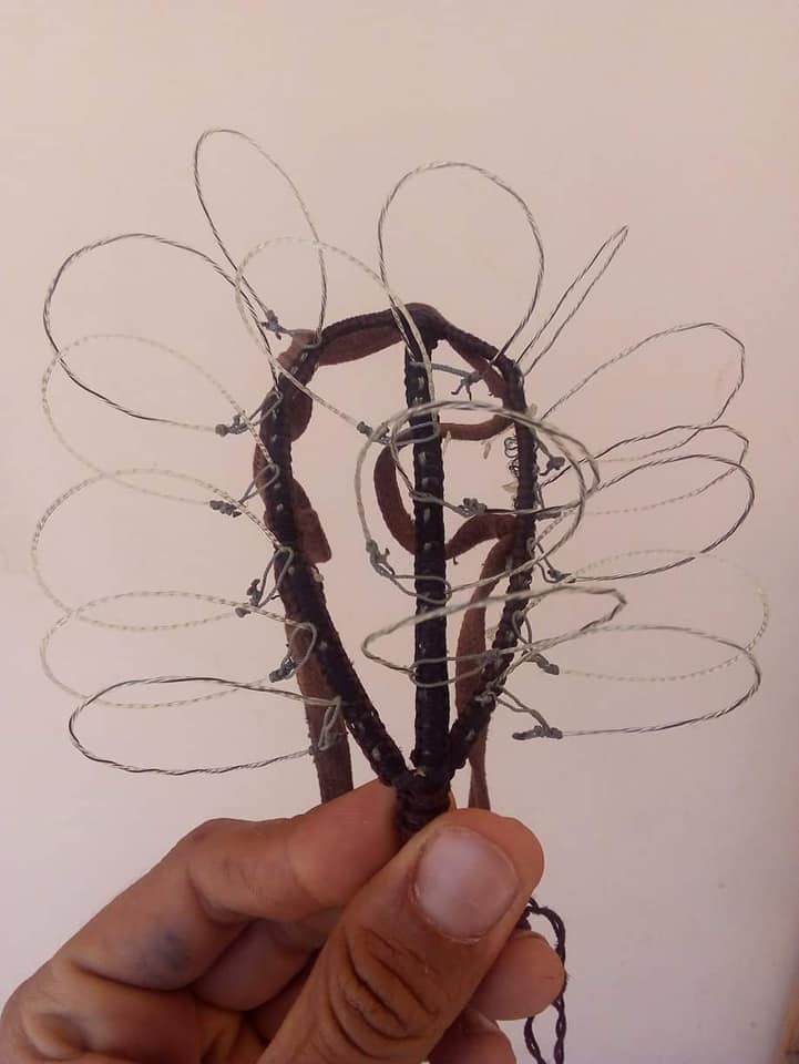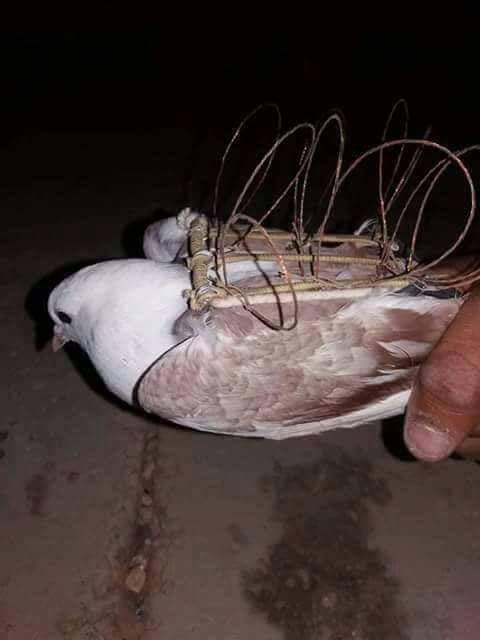 واستطرد بالقول: "في حين يتم صنع هيكل الشبكة من السلك المعدني المرن، حيث يُشمع خيط الحرير أو النايلون المغزول بشكلٍ جيد بشمع العسل، ثمّ يُحاك الخيط على السلك المعدني مع وضع الخيط القطني الذي يُربط بأرجل الحمامة بطريقة العقد المتخالفة، وتوضع العين ثمّ تكرر نفس الطريقة ويفضل أن تكون عيون الشبكة متباعدة عن بعض بقدر 2سم حتى الانتهاء منها، وهذه الشّبكة تغطّي جسم الحمامة (الطعم) ما عدا الرجلين والجناحين حتى تتحرّك بسهولة".