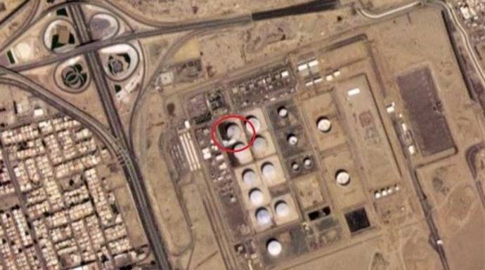 (الصورة المرفقة نشرتها وسائل إعلام موالية للحوثيين في اليمن تقول إنها تُظهر بواسطة الأقمار الصناعية أضراراً لحقت بمحطة توزيع منتجات بترولية تتبع لشركة أرامكو السعودية في مدينة جدة، جراء هجوم تبناه الحوثيون، فجر الاثنين)