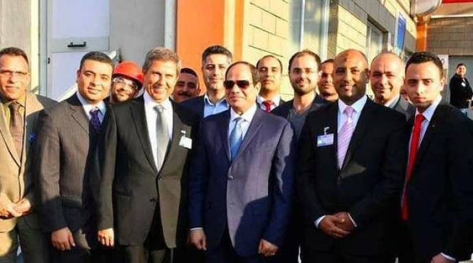 (محمد صباغ شرباتي إلى يمين الرئيس المصري عبد الفتاح السيسي، الذي زار إحدى مصانع شرباتي في مصر - أرشيفية)