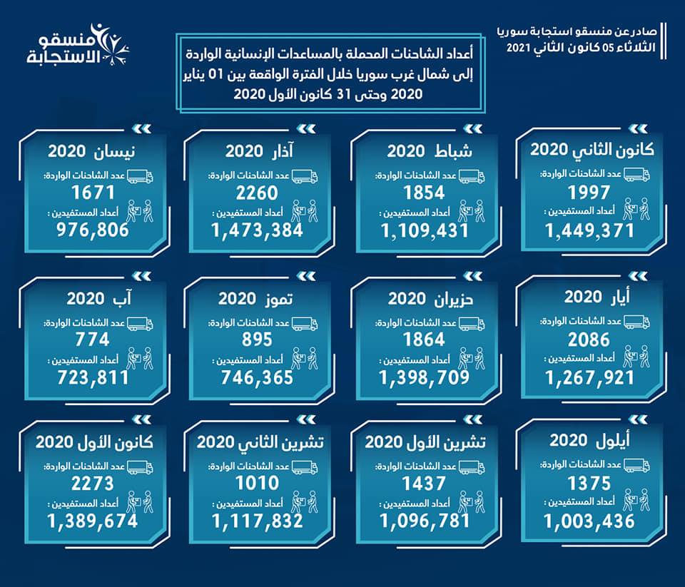 أصدر فريق "منسقو استجابة سوريا"، صباح يوم الثلاثاء، إحصائية بأعداد الشاحنات المحملة بالمساعدات الإنسانية الواردة إلى شمال غرب سوريا خلال العام الفائت 2020.