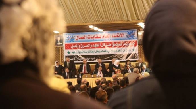 (الصورة المرفقة أرشيفية من مؤتمر قديم للاتحاد العام لنقابات العمال التابع للنظام)