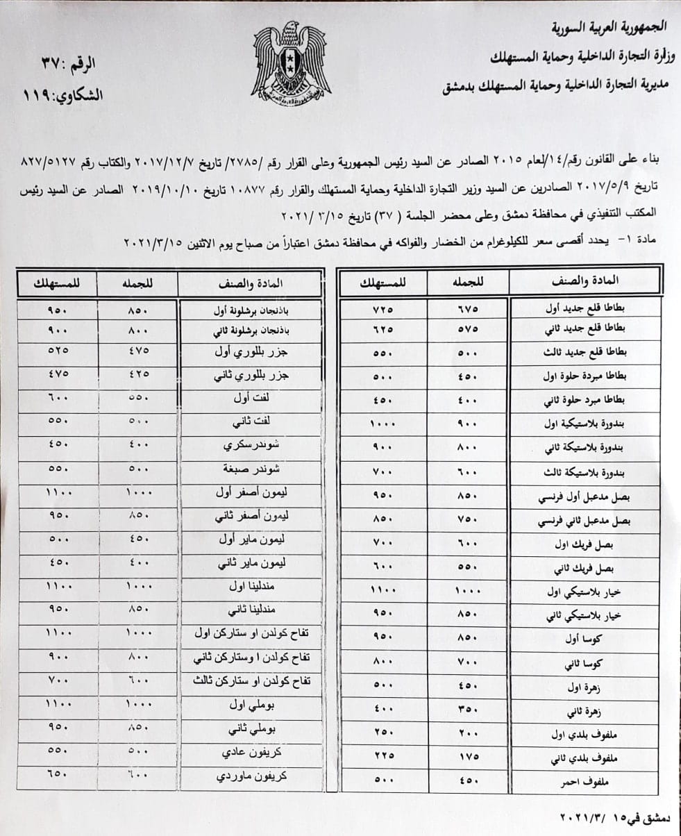 (قائمة رسمية نشرت مؤخراً لأسعار الخضار في دمشق)