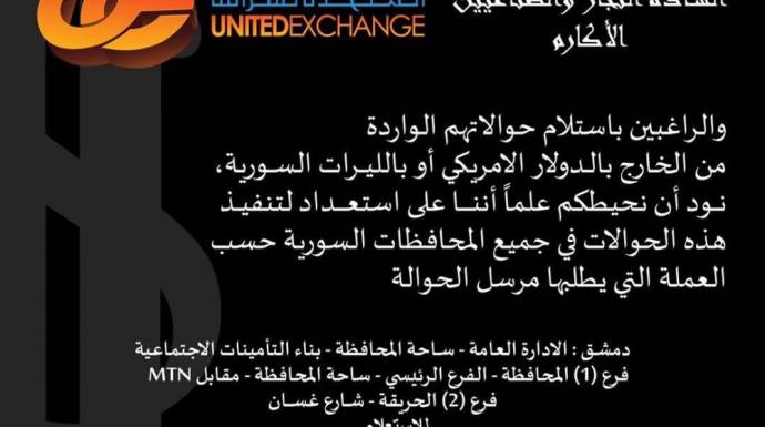 وقالت الشركة في إعلانها، إنه يمكن للتجار والصناعيين استلام حوالاتهم الواردة من الخارج، حسب العملة التي يطلبها مرسل الحوالة، وفي جميع المحافظات السورية.