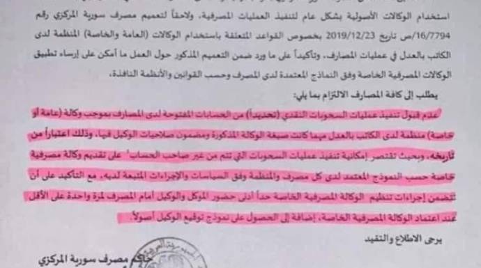 في إجراء جديد يستهدف الحد من السيولة المتاحة بالليرة السورية في الأسواق، أصدر مصرف سورية المركزي تعميماً إلى المؤسسات المالية والمصرفية العاملة في سوريا، يفيد بعدم قبول تنفيذ عمليات السحب النقدي من الحسابات المفتوحة لدى المصارف بموجب وكالة عامة أو خاصة منظمة لدى الكاتب بالعدل، مهما كانت صيغة الوكالة المذكورة، ومضمون صلاحيات الوكيل فيها، وذلك اعتباراً من تاريخ صدور التعميم المؤرخ بـ 29 آب/أغسطس الفائت.