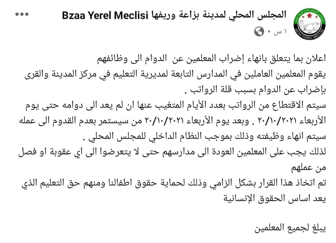 وكعقوبة على الإضراب وبحال استمراره، سوف يتم فصل المعلمين والمعلمات المشاركين فيه، وفق ما أشار بيان مشترك للمجالس المحلية في المدن الثلاثة، والذي أضاف أنه سيتم قطع الرواتب بعدد الأيام المتغيب عنها إن لم يعد المعلم إلى دوامه حتى يوم الأربعاء 20/10/2021.