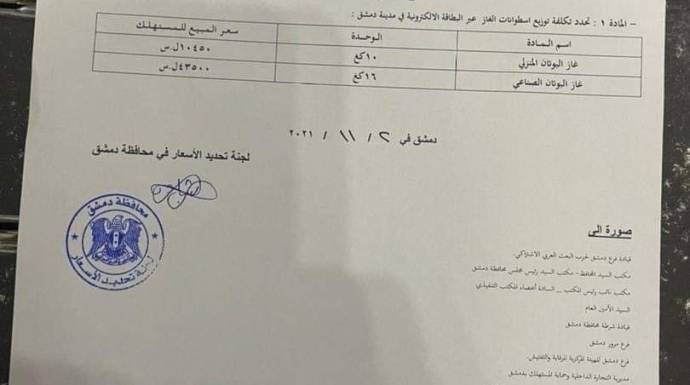 ووفق مصادر إعلامية موالية، فإن السعر المحدد من جانب محافظة دمشق، هو سعر المبيع للمستهلك، ويتضمن تكلفة نقل الأسطوانة.