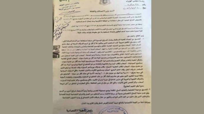 وكانت وسائل إعلام موالية قد تداولت كتاباً صادراً عن رئيس اللجنة الاقتصادية وزير الاقتصاد والتجارة الخارجية، بحكومة النظام، سامر خليل، موجّهاً لوزير الاتصالات، بخصوص "الشرائح الميسورة" التي يمكن استبعادها من البطاقة الإلكترونية بهدف "إيصال الدعم لمستحقيه". وطلب الكتاب استناداً لما تم الاتفاق عليه في اجتماع اللجنة الاقتصادية بجلسته رقم /43/ تاريخ 8/11/2021، التنسيق مع الجهات المعنية لاستكمال بيانات الشرائح الميسورة التي سيتم استبعادها من الدعم كمرحلة أولى (كبار ومتوسطي المكلفين ضريبياً- كبار المساهمين الذين يملكون 5 بالمئة أو أكثر في أسهم الشركات المدرجة في سوق دمشق للأوراق المالية- أصحاب ومؤسسي المصارف الخاصة والمالكين والمؤسسين للجامعات والمدارس والروضات والمعاهد الخاصة- المقاولين والمتعهدين من الفئات الثانية وما فوق- أعضاء غرف التجارة من الفئات الأولى والثانية والمصدرين- المستوردين والمخلصين الجمركيين- أصحاب السجلات السياحية ماعدا مهنة الأدلاء السياحيين والمهن التراثية- أصحاب المقاهي والكافتيريات سواء المصنفة سياحياً أم غير المصنفة – أصحاب المهن الحرة المسجلين لدى النقابات (أطباء اختصاصيين محاسبين قانونيين) ممن يمارسون المهنة منذ أكثر من عشر سنوات – أصحاب المشافي الخاصة والمراكز الطبية والمخابر ومراكز التجميل والمساهمين فيها – الصيادلة ممن يمارسون المهنة منذ أكثر من عشر سنوات ومستثمري الصيدليات- أصحاب المكاتب الهندسية والقانونية والمحاماة من غير العاملين في الدولة ويمارسون المهنة منذ أكثر من عشر سنوات- أصحاب المكاتب العقارية -الصياغ- مكاتب وشركات بيع وتأجير السيارات وتلك المحدثة منها وفق قانون الاستثمار- شركات النقل- وكلاء النقل البحري- أصحاب ومستثمري الكازيات والأفران الخاصة- مالكي السيارات السياحية التي سعة محركها 15.1 سم3 وما فوق من موديل عام 2008 وما بعده- الأسرة التي تملك أكثر من سيارة- الحاصلين على بطاقة فيميه – المغتربين الذين مضى على مغادرتهم للبلاد أكثر من عام- العاملين في السفارات والقنصليات والمنظمات الدولية والشركات لأجنبية أو العربية التي تمارس نشاطاً في سورية ومن في حكمهم- مالكي ومستثمري مراكز تعليم قيادة السيارات- أصحاب مراكز الفحص الفني للآليات- مالكي أكثر من منزل في المحافظة نفسها ومالكي العقارات في المناطق من أعلى شريحة سعرية وفق التقييم العقاري).
