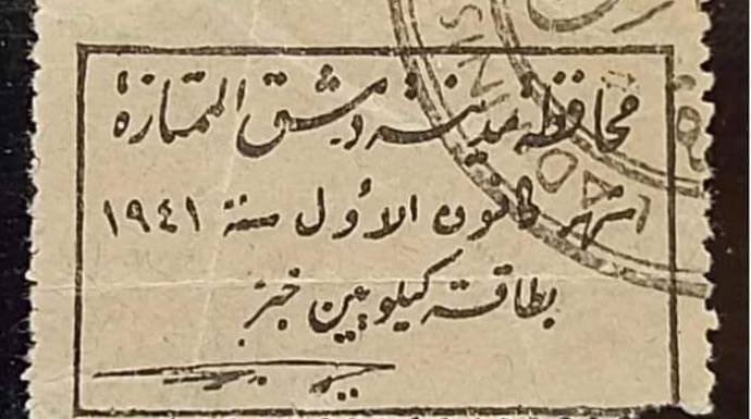 تداولت وسائل إعلام موالية للنظام، ما قالت إنه صورة لأول بطاقة ذكية للخبز تم إصدارها عن محافظة دمشق في عام 1941، مشيرة إلى الحكومة السورية في حينها اضطرت لإصدار قسيمة الخبز لتخفيف الأزمة التي حصلت في ذلك الوقت.