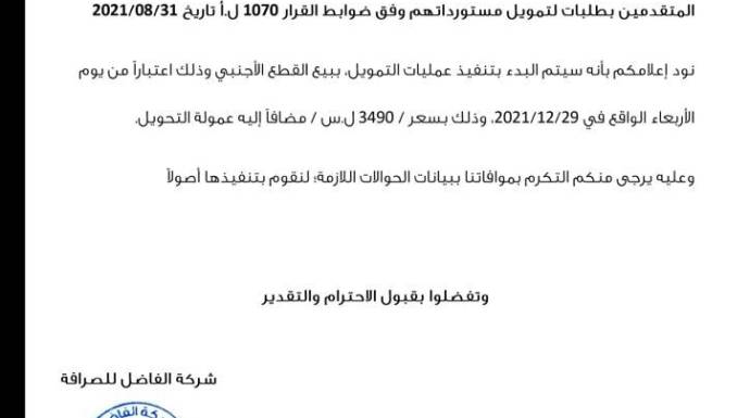 ووفق كتَابَين صادرَين عن الشركتين المشار إليهما، يمكن للتجار والصناعيين الذين تقدموا بطلبات لتمويل مستورداتهم، بالقطع الأجنبي، من شركات الصرافة المُرخّصة، الحصول على التمويل المطلوب من جانبهم، حال توفير بيانات الحوالات المطلوبة، وذلك بسعر 3490 ليرة للدولار الواحد.