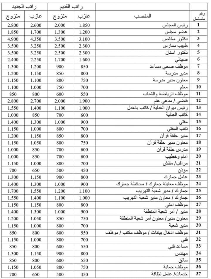 وشمل رفع الرواتب كافة الموظفين، من رؤساء المجالس المحلية، وأعضاء المجالس، والكوادر الصحية والتربوية والرياضية والأمنية.