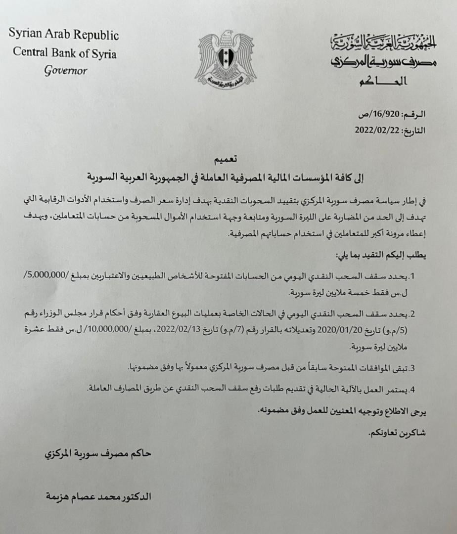 وقال التعميم الذي نشره المركزي إنه قرر رفع "سقف السحب النقدي اليومي من الحسابات المفتوحة للأشخاص الطبيعيين والاعتباريين بمبلغ خمسة ملايين ليرة سورية بدل مليونين".