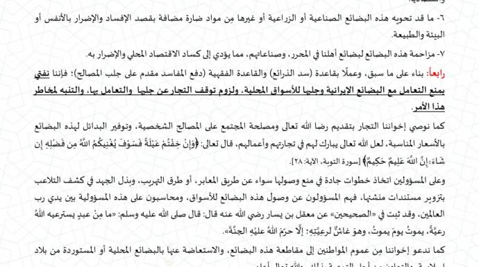 كما ولفت بيان الفتوى إلى ضرر مزاحمة البضائع الإيرانية لبضائع التجار في الشمال السوري وصناعاتهم، ما قد يؤدي إلى كساد الاقتصاد المحلي والإضرار به.