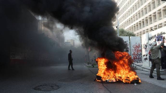 وبالانتقال إلى العاصمة اللبنانية بيروت، فقد أضرم متظاهرون لبنانيون النار في إطارات سيارات يوم الأربعاء أمام مدخل مصرف لبنان (البنك المركزي) للتعبير عن غضبهم من التراجع المستمر في قيمة الليرة.