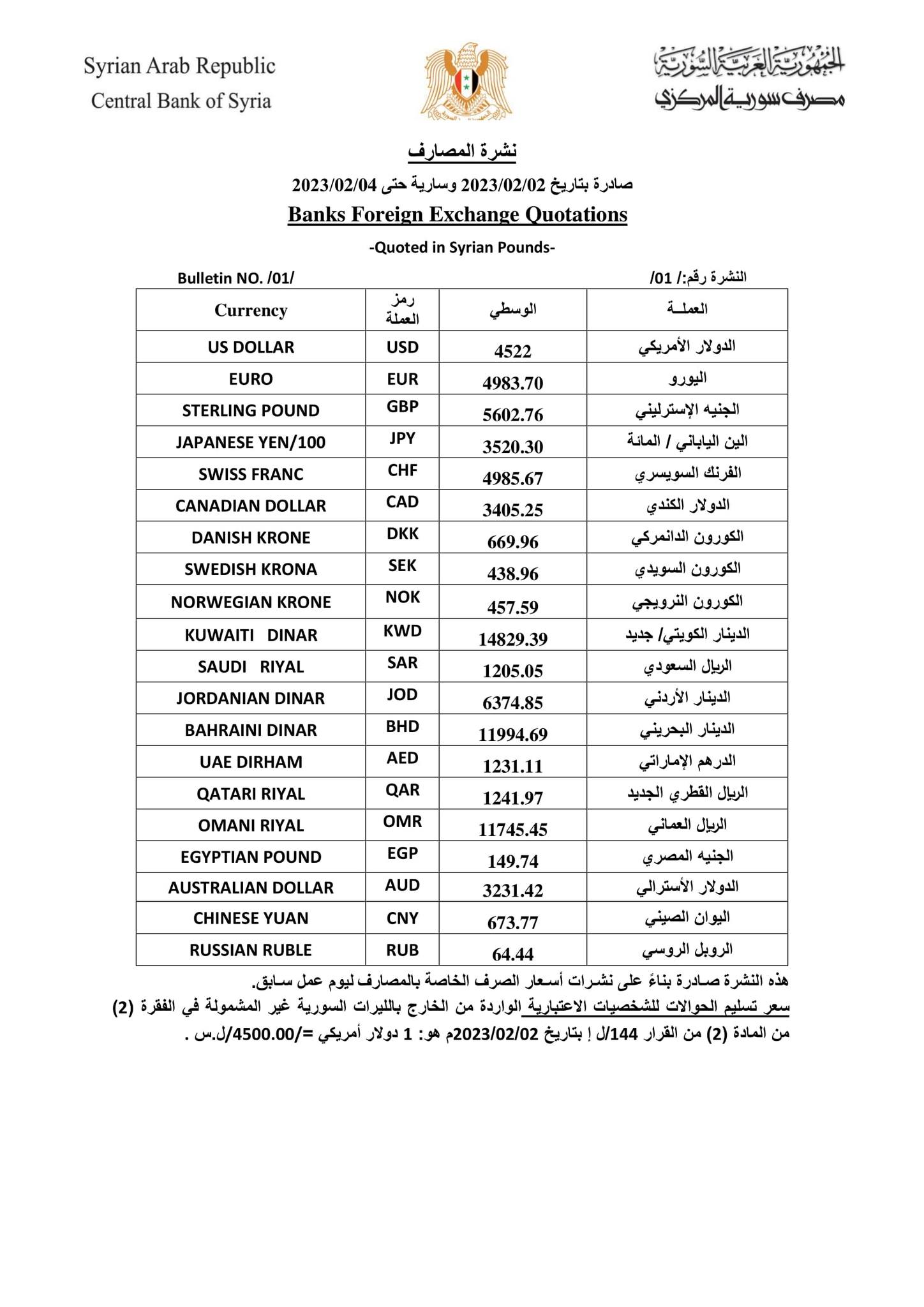 ونشر المركزي إصداره الأول لنشرة "الحوالات والصرافة"، يوم الخميس، حدد فيه سعر الدولار بـ 6650 ليرة سورية. على أن يُعتمد هذا السعر في شراء القطع الأجنبي نقداً من الأشخاص الطبيعيين عن طريق شركات الصرافة والمصارف، وكذلك في شراء الحوالات الخارجية، التجارية، وتلك الواردة إلى الأشخاص الطبيعيين (الأفراد)، وكذلك في تقييم البيانات المالية الدولية لشركات الصرافة المرخصة.