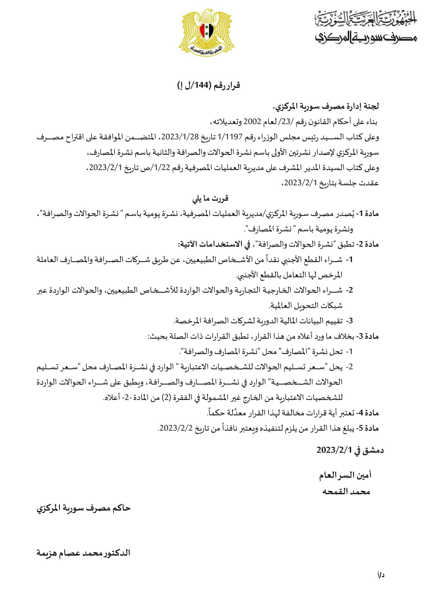 أصدر مصرف سورية المركزي، الخاضع للنظام في دمشق، قراراً باعتماد نشرة أسعار صرف جديدة، باسم "نشرة الحوالات والصرافة"، يُسمح بموجبها للمصارف وشركات الصرافة بتسليم قيم الحوالات الخارجية الواردة وتصريف المبالغ النقدية (كاش)، وفق سعر صرف مقارب لسعر التداول (السعر المحدد وفق العرض والطلب بسوق القطع غير الرسمي)، وذلك وفق خبر صحفي نشره المركزي في صفحته الرسمية بـ "فيسبوك".