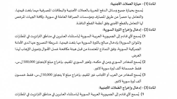 أما في بند إدخال وإخراج العملات الأجنبية، فسمح القرار لأي قادم إلى سوريا (باستثناء العابرين في مناطق الترانزيت في المطارات والموانئ السورية)، بإدخال الأوراق النقدية الأجنبية (بنكنوت) حتى مبلغ 500 ألف دولار أمريكي لا غير، أو ما يعادله بالعملات الأجنبية الأخرى، شريطة التصريح عنها لدى الأمانة الجمركية السورية، وفق النماذج المعتمدة لهذا الغرض من جانب هيئة مكافحة غسل الأموال وتمويل الإرهاب. ونوّه القرار إلى الاحتفاظ بنسخة عن هذا التصريح لاستخدامه عند مغادرة البلد عند الحاجة.