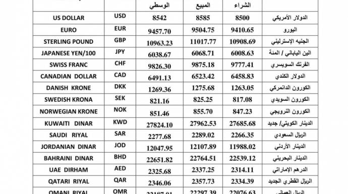 ووفق نشرة "السوق الرسمية" الجديدة، حدّد المركزي الدولار الواحد بـ 8500 ليرة للشراء، وبـ 8585 ليرة للمبيع، وبـ 8542 ليرة كسعر وسطي.