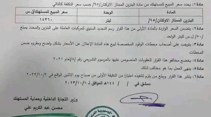 أصدرت وزارة التجارة الداخلية التابعة للنظام في وقت متأخر من ليل أمس، نشرة جديدة لأسعار المحروقات في السوق الحر، رفعت بموجبها أسعار المازوت والفيول والغاز السائل، بينما خفضت سعر البنزين أوكتان 95.