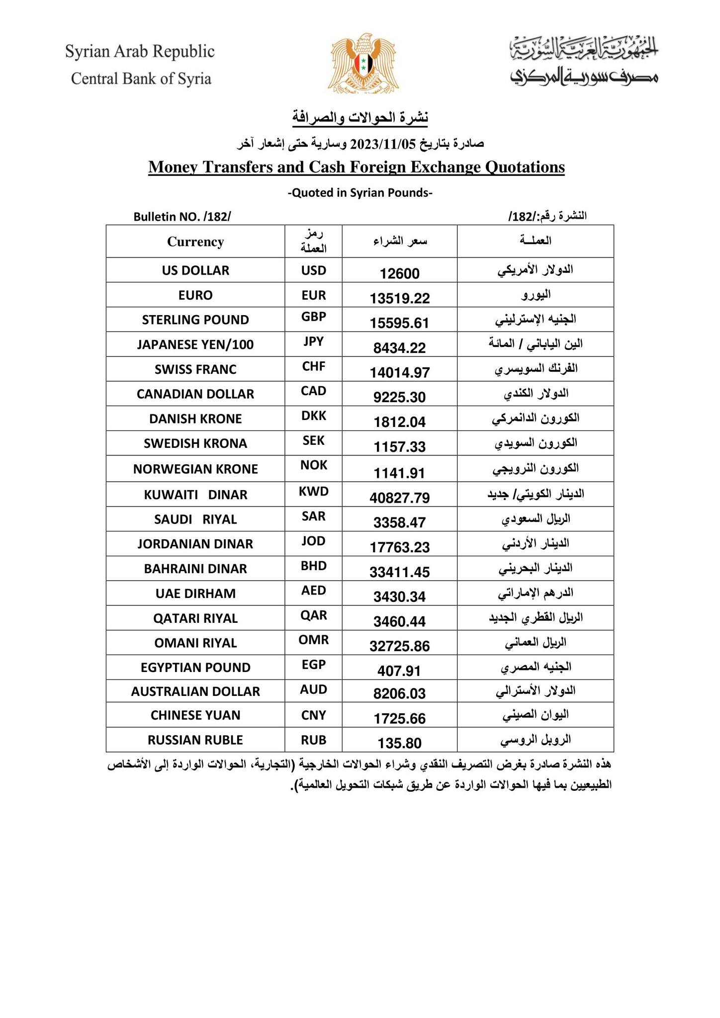 ورفع المركزي "دولار الحوالات"، 100 ليرة، ليصبح بـ 12600 ليرة.