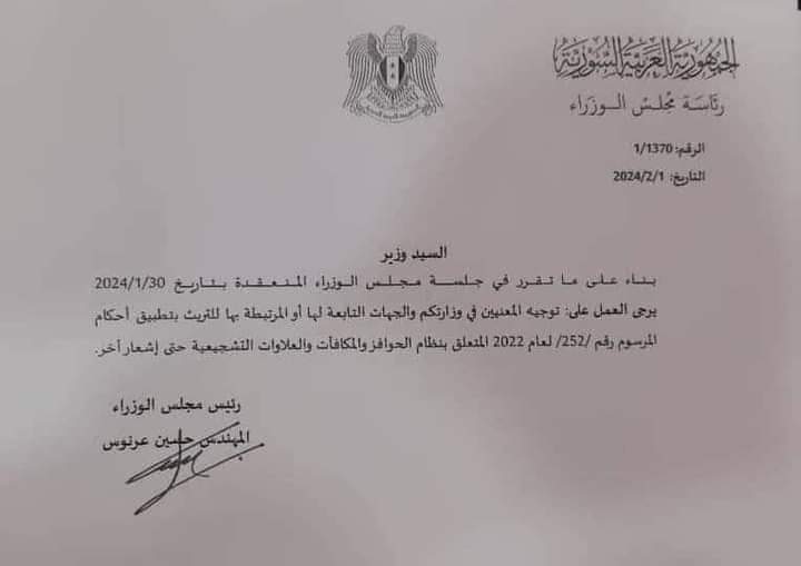 أعلنت حكومة النظام عن إيقاف تنفيذ مرسوم الحوافز حتى إشعار آخر، والذي كان قد أصدره بشار الأسد في شهر أيلول من العام 2022، وهو خاص بنظام الحوافز والمكافآت والعلاوات التشجيعية.