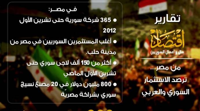 تقدّر بعض التقارير الرسمية –المنسوبة لمجلس الأعمال السوري المصري- عدد الشركات الاستثمارية السورية التي أسست في مصر بنحو 365 شركة حتى تشرين الأول/اكتوبر 2012. لكن المراقبين يؤكدون أن هذا الرقم ربما تضاعف في الأشهر التالية، فقد تسارعت حركة انتقال رأس المال السوري إلى مصر في الأشهر الثلاثة الأخيرة من العام الماضي بصورة غير مسبوقة.
