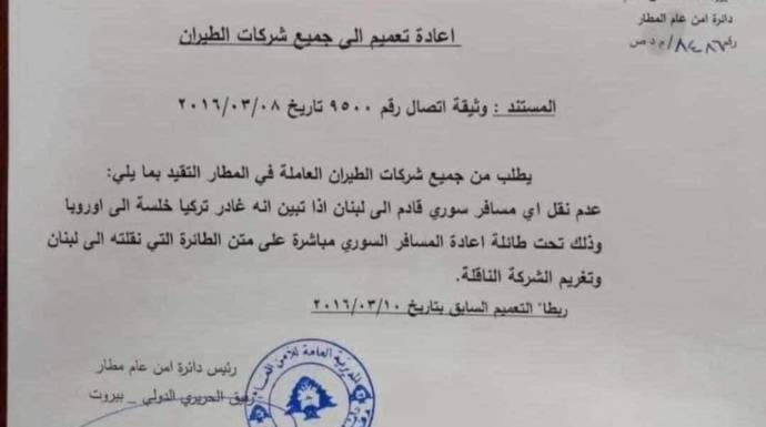 اللبناني تعميماً طلبت فيه من جميع شركات الطيران، عدم نقل أي مسافر سوري قادم إلى لبنان إذا تبين أنه دخل