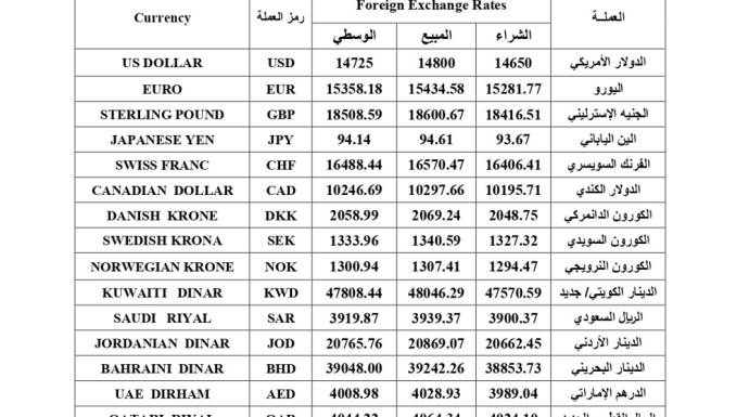 ووفق نشرتَي "المصارف والصرافة"، و"النشرة الرسمية"، حدّد المركزي سعر شراء الدولار الأمريكي بـ 14650 ليرة، فيما حدّد سعر المبيع بـ 14800 ليرة. وحدّد سعر تسليم الحوالات الخارجية بالليرة السورية، بقيمة 14650 ليرة لكل دولار أمريكي.