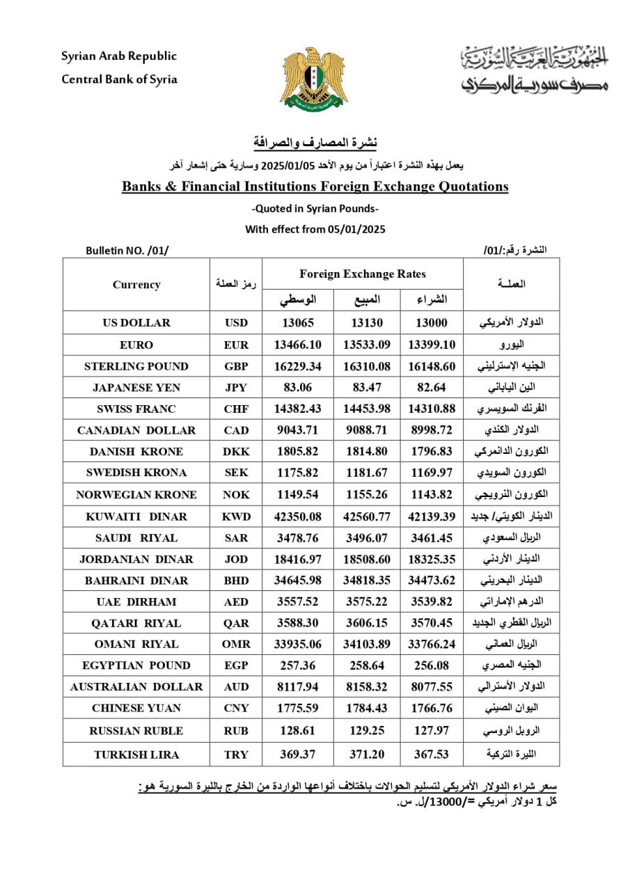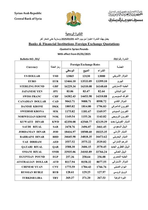 رفع مصرف سوريا المركزي سعر صرف الليرة السورية مقابل الدولار، في أول نشراته الرسمية خلال العام الجديد.