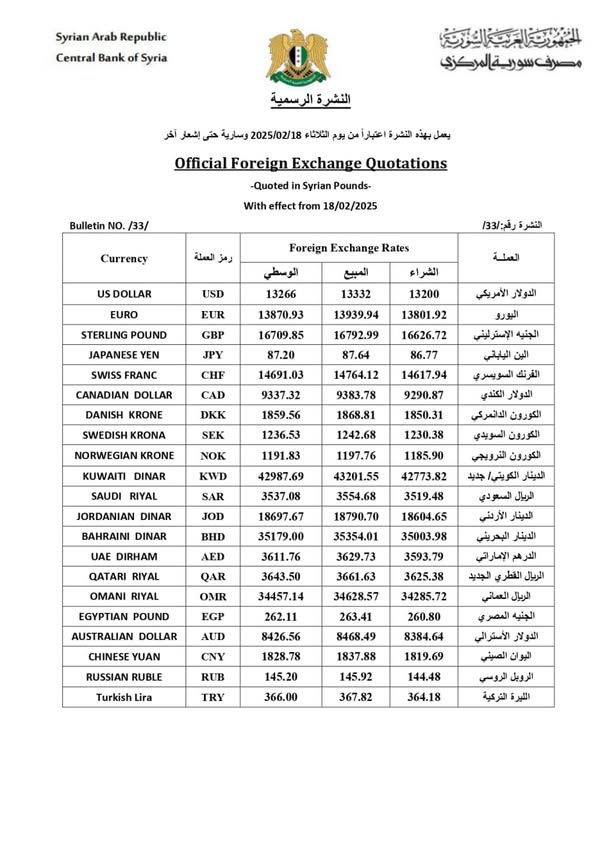 أبقى مصرف سوريا المركزي، سعر الصرف الرسمي لليرة السورية مقابل الدولار، مستقراً، دون تغيير، في نشرتَي "المصارف والصرافة"، و"النشرة الرسمية"، الصادرتين عنه، قبيل ظهر اليوم الثلاثاء.