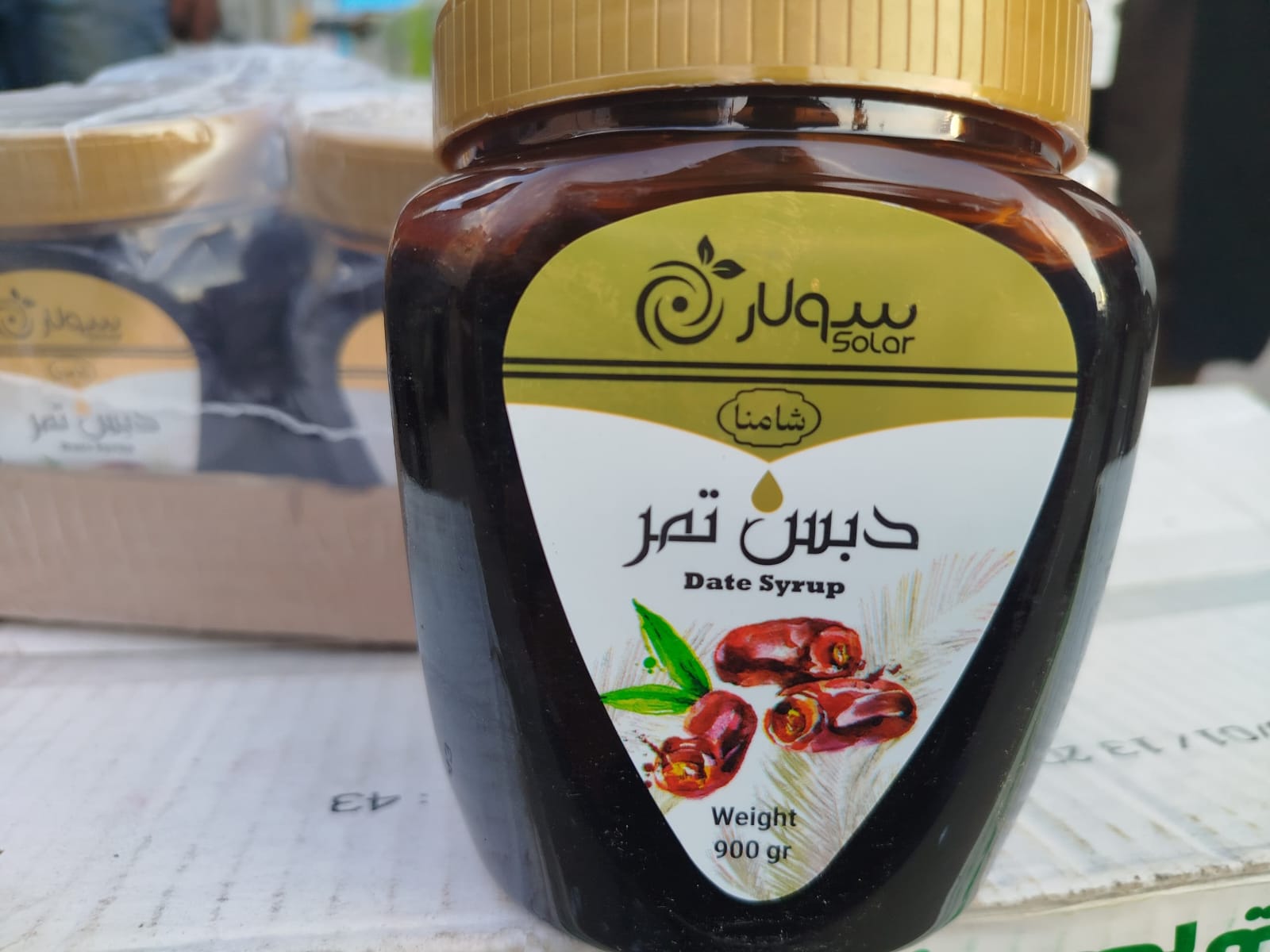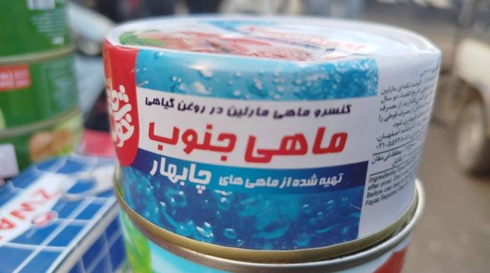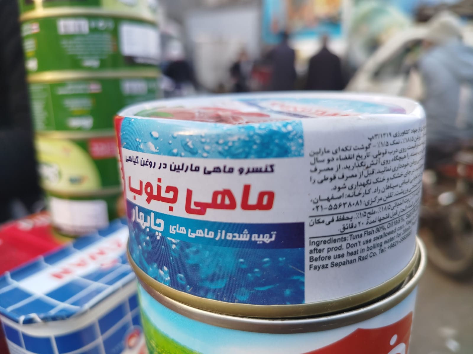 والتقط المراسل تسجيلاً وصوراً توضّح أصناف من الغذائيات، (كيك مُعلّب، تونا، ودبس تمر)، مكتوب على أغلفتها الخارجية، بصورة واضحة، "صُنع في إيران"، أو اسم المدينة الإيرانية المصنوعة فيها.