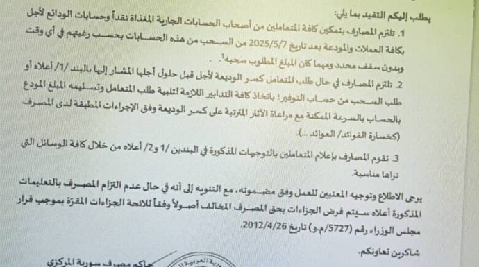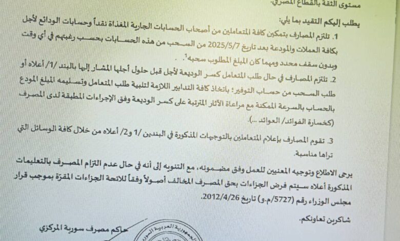 ونوه المصدر، وفق "الوطن"، بأن القرار يأتي في إطار تعزيز الثقة بالقطاع المصرفي، محذراً من أن عدم الامتثال للتعليمات سيؤدي إلى فرض جزاءات على المصارف المخالفة وفقاً للقوانين النافذة.