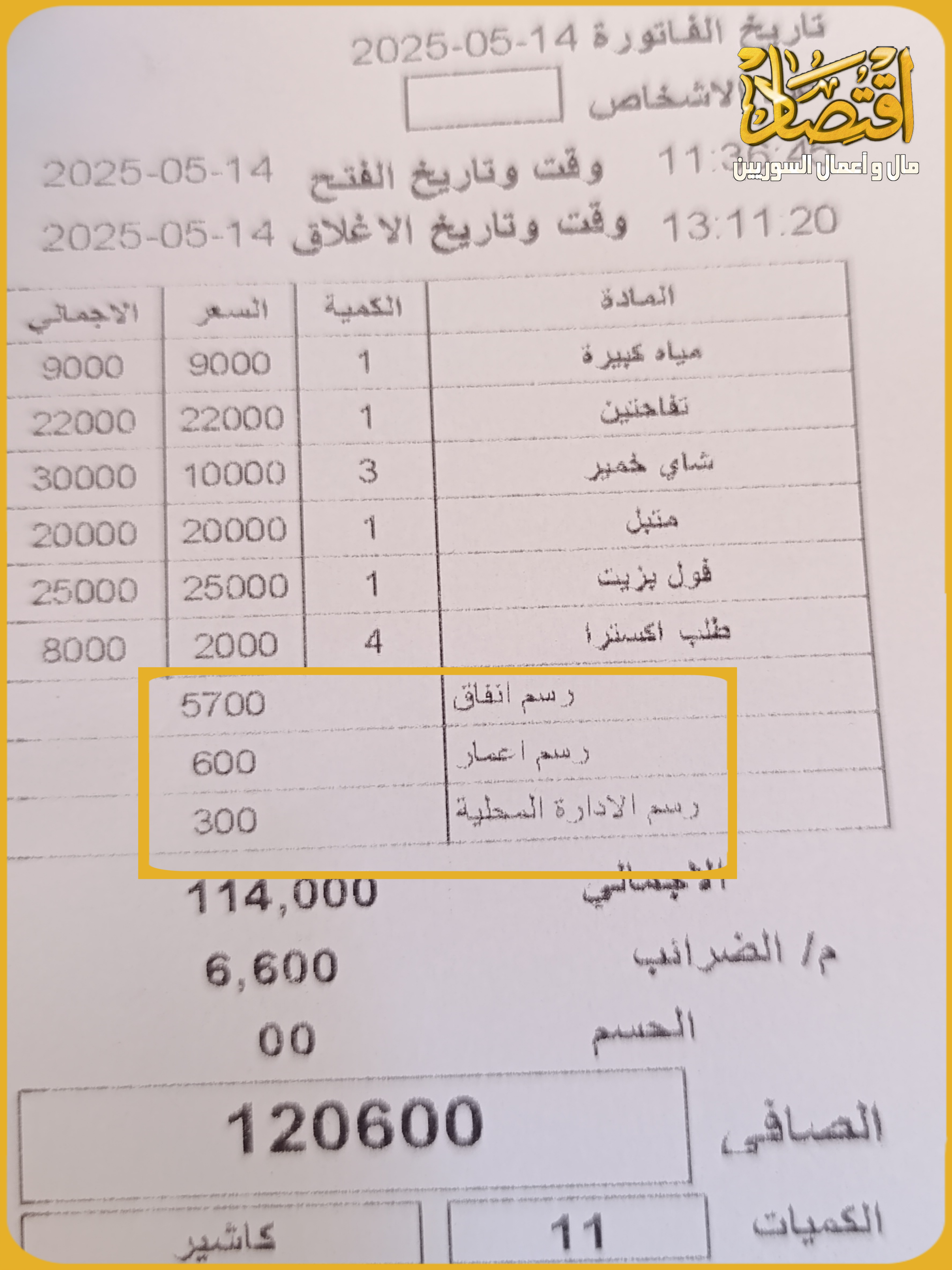 رصد مراسل "اقتصاد"، فاتورة خدمات لأحد المطاعم الشعبية بدمشق، حيث تشكّل الضرائب نحو 6%. ولوحظ بقاء ذات الرسوم التي كانت قائمة في عهد النظام السابق (رسم إنفاق، رسم إعمار، رسم الإدارة المحلية).