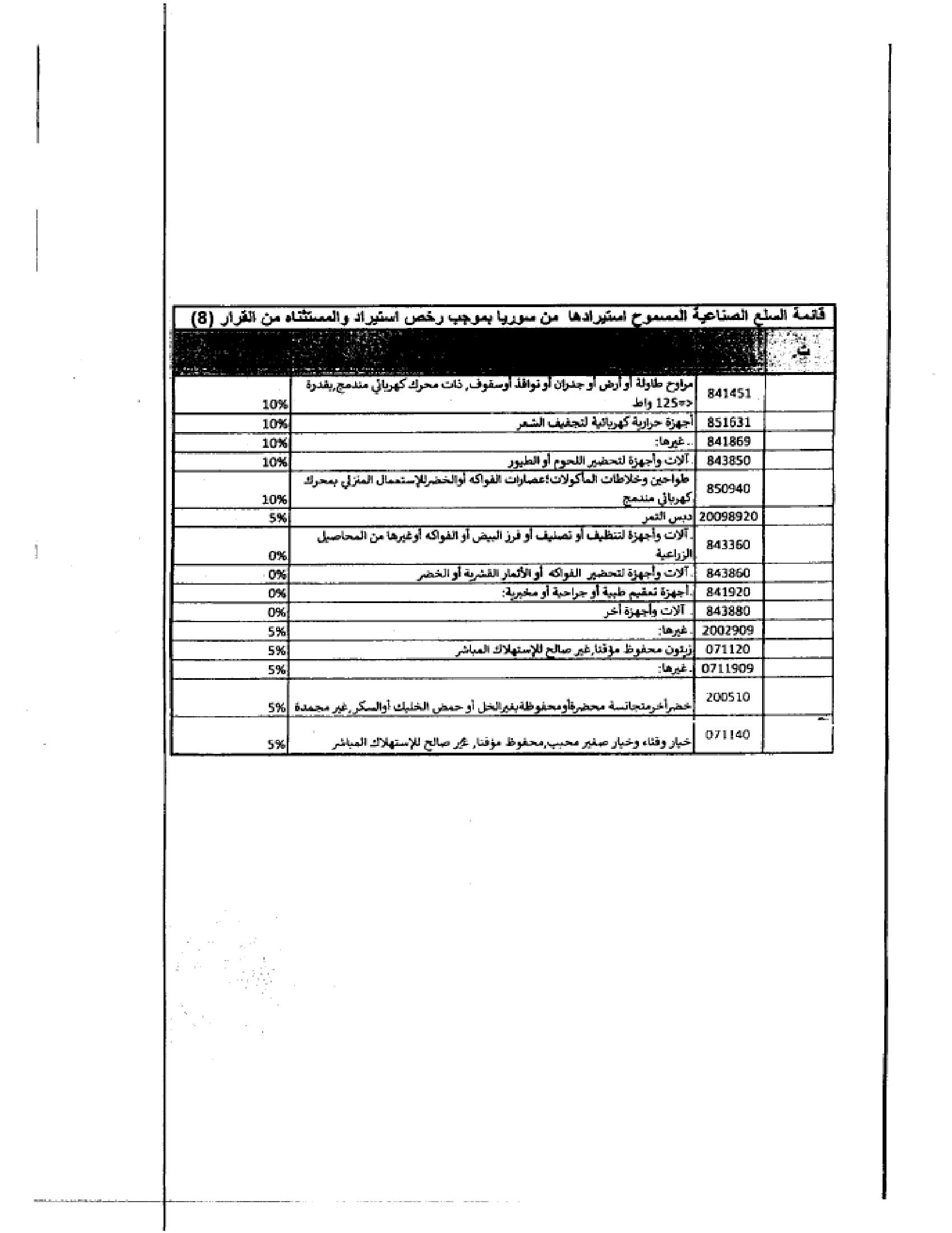 ومن ضمن السلع التي أتاح القرار استيرادها، مراوح بأصناف مختلفة، وأجهزة كهربائية حرارية لتجفيف الشعر، وآلات وأجهزة تحضير اللحوم أو الطيور، وبعض أصناف السلع الغذائية، كدبس التمر، والزيتون المحفوظ مؤقتاً وغير الصالح للاستهلاك المباشر.