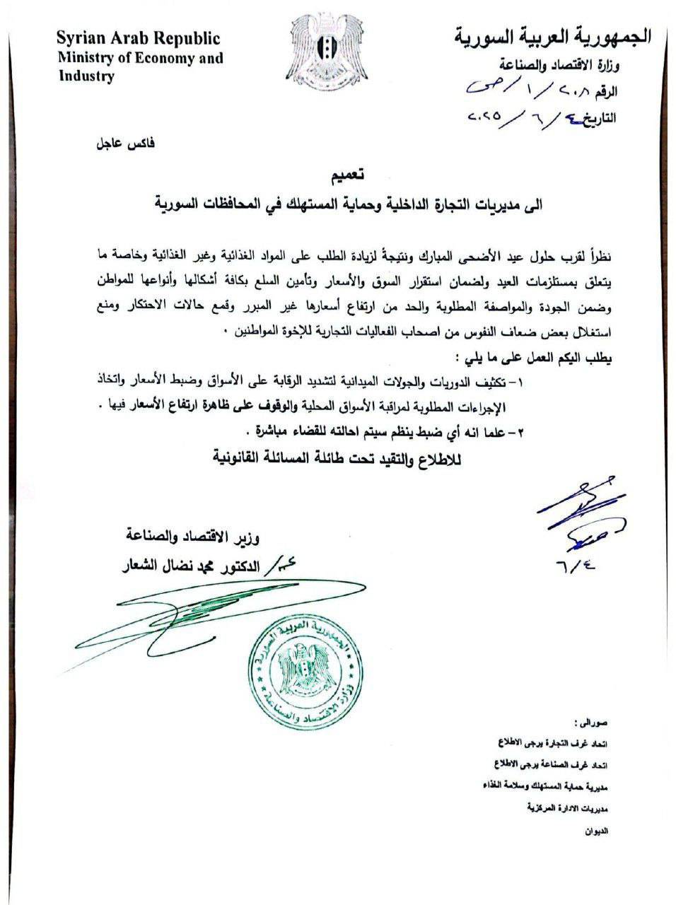 نشرت وزارة الاقتصاد والصناعة، أمس الأربعاء، صورة تعميم صادر عن الوزير، محمد نضال الشعار، يطلب فيه من جميع مديريات التجارة الداخلية وحماية المستهلك في المحافظات السورية بتكثيف الدوريات والجولات الميدانية على الأسواق.
