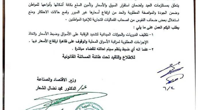 وبالعودة إلى نص التعميم، نجد أنه طلب من دوريات "التموين" اتخاذ الإجراءات المطلوبة لمراقبة الأسواق المحلية والوقوف على ظاهرة ارتفاع الأسعار فيها. محذّراً من أن أي ضبط ينظّم، سيتم إحالته للقضاء مباشرة.