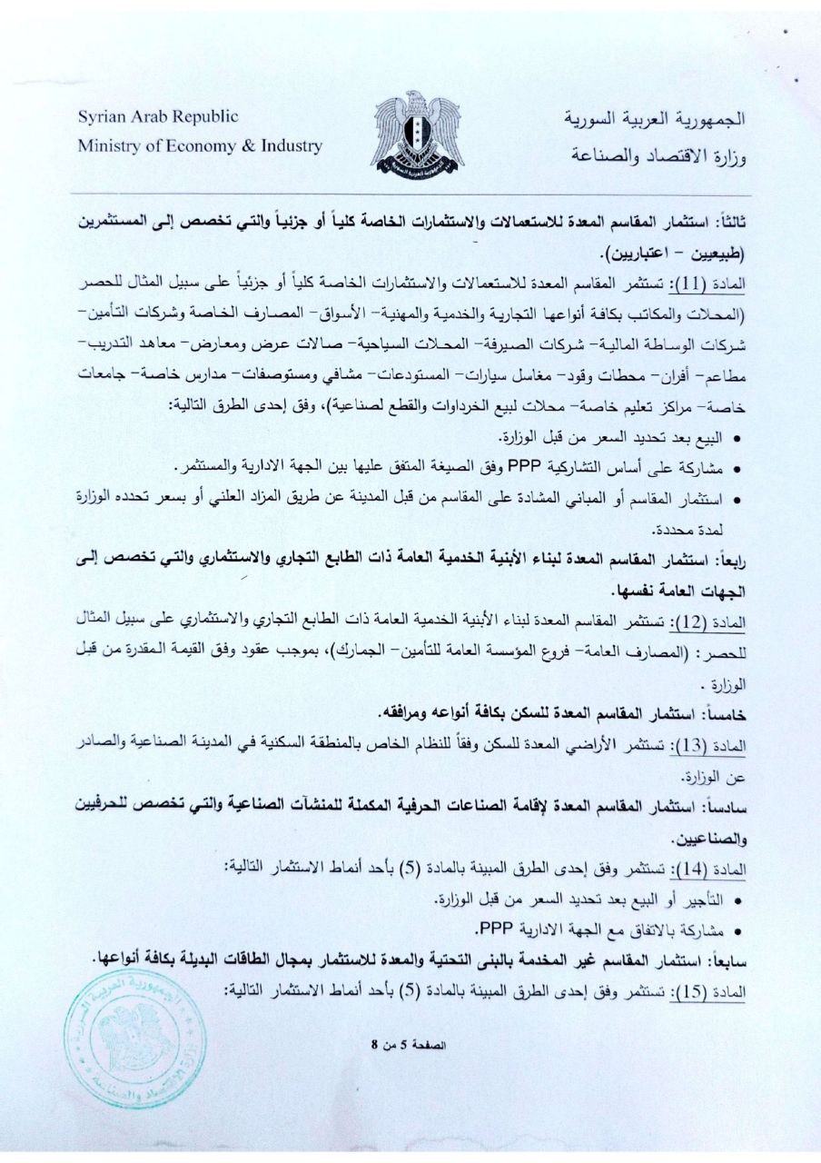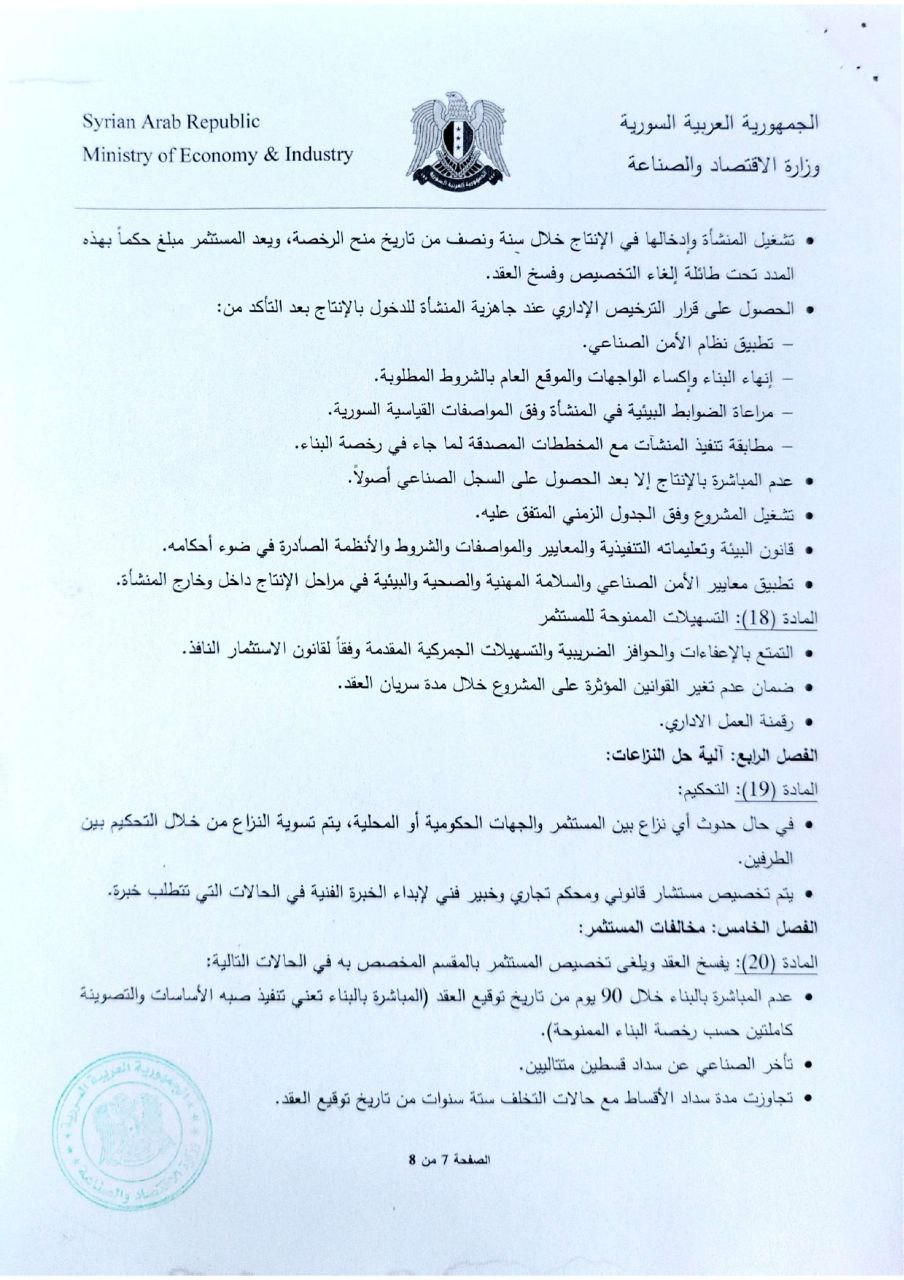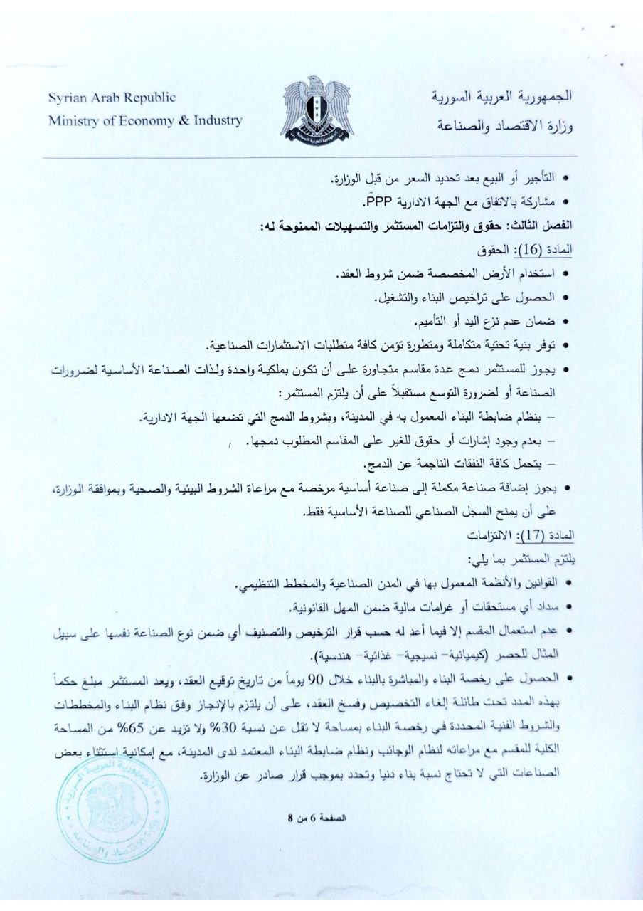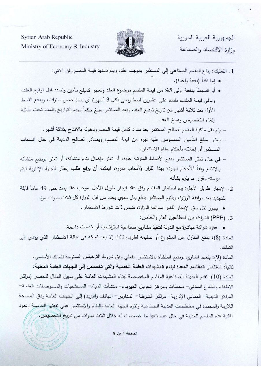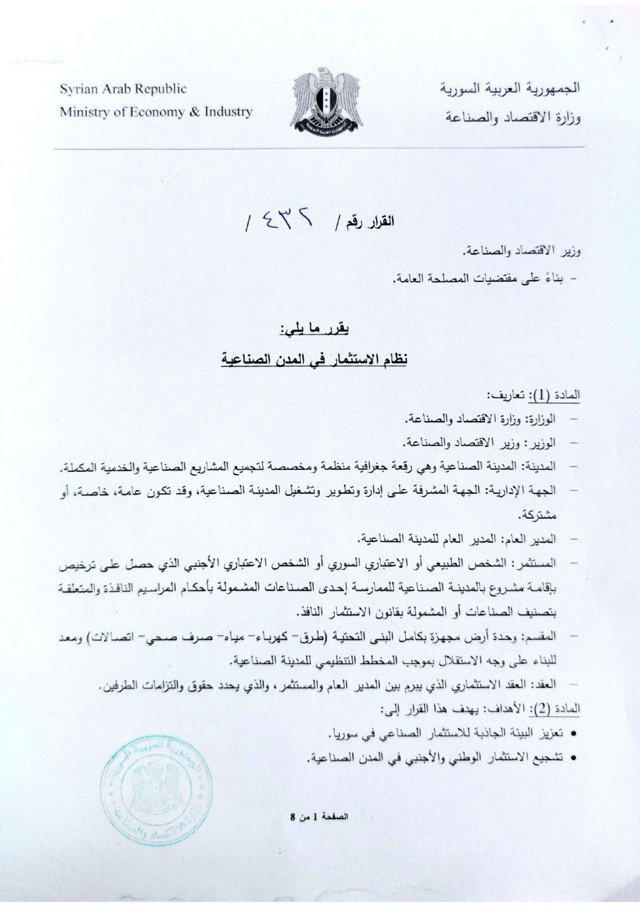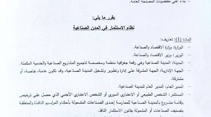 إقرار النظام الجديد للاستثمار في المدن الصناعية بسوريا