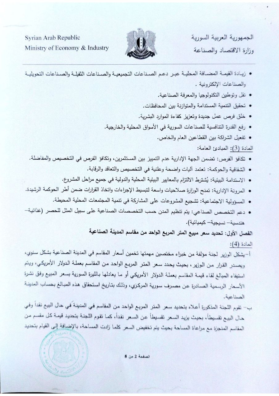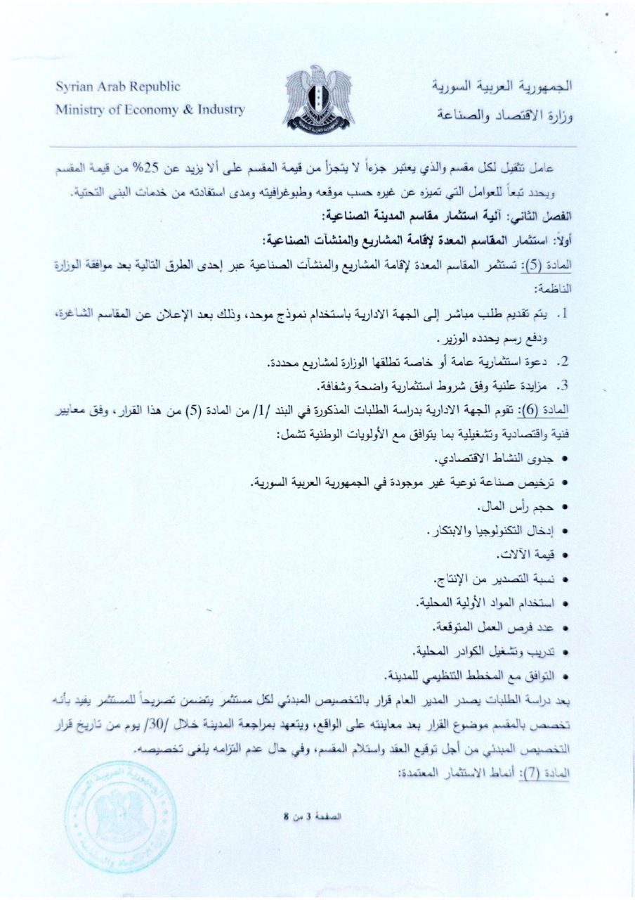 وبشأن تحديد سعر مبيع المتر المربع الواحد من مقاسم المدينة الصناعية يتم من خلال تشكيل الوزير للجنة مؤلفة من خبراء مختصين مهمتها تخمين أسعار المقاسم في المدينة الصناعية بشكل سنوي، على أن يصدر القرار من الوزير، يحدد فيه سعر المتر المربع الواحد من المقاسم بعملة الدولار الأمريكي، ويتم استيفاء المبالغ لقاء قيمة المقاسم بعملة الدولار الأمريكي، أو ما يعادلها بالليرة السورية بسعر المبيع وفق نشرة الأسعار الرسمية الصادرة عن مصرف سورية المركزي، وذلك بتاريخ استحقاق هذه المبالغ بحساب المدينة الصناعية.