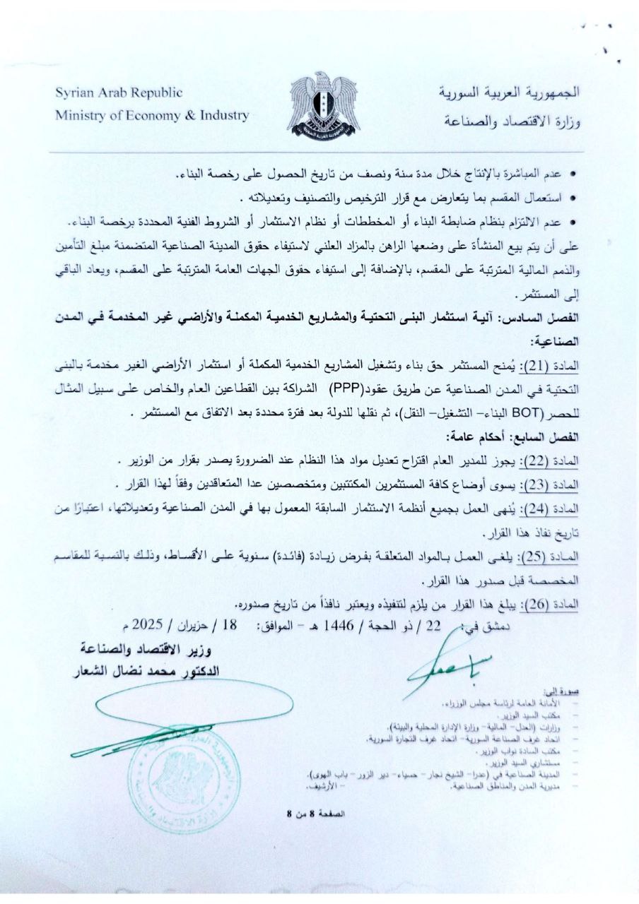 وأكد وزير الاقتصاد والصناعة في تصريح عقب توقيعه القرار أن النظام الجديد يعزز بيئة الاستثمار ويجذب رؤوس الأموال ويحفز النشاط الاقتصادي في المدن الصناعية، التي تُعد ركيزة أساسية بمرحلة التعافي وإعادة الإعمار، مشيراً إلى أن النظام الجديد يستند إلى معايير مرنة وجاذبة، بما يتماشى مع المتطلبات الحالية، ويواكب التحولات الاقتصادية في المدن الصناعية.