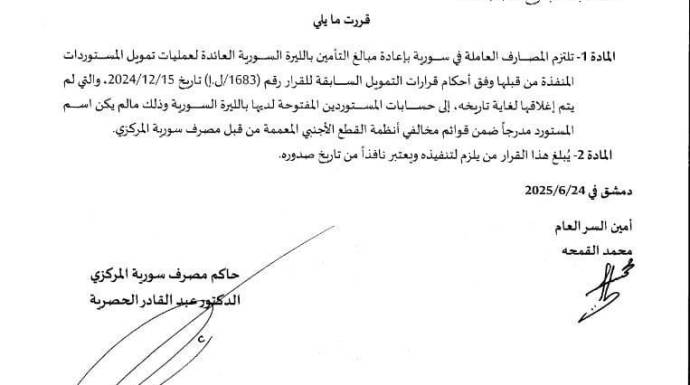 أصدر مصرف سوريا المركزي قراراً يُلزم بموجبه جميع المصارف العاملة في البلاد بإعادة مبالغ التأمين بالليرة السورية إلى حسابات المستوردين لديها، وذلك بشرط ألا يكون المستورد ضمن قوائم مخالفي أنظمة القطع الأجنبي المعمّمة من قبل المصرف.