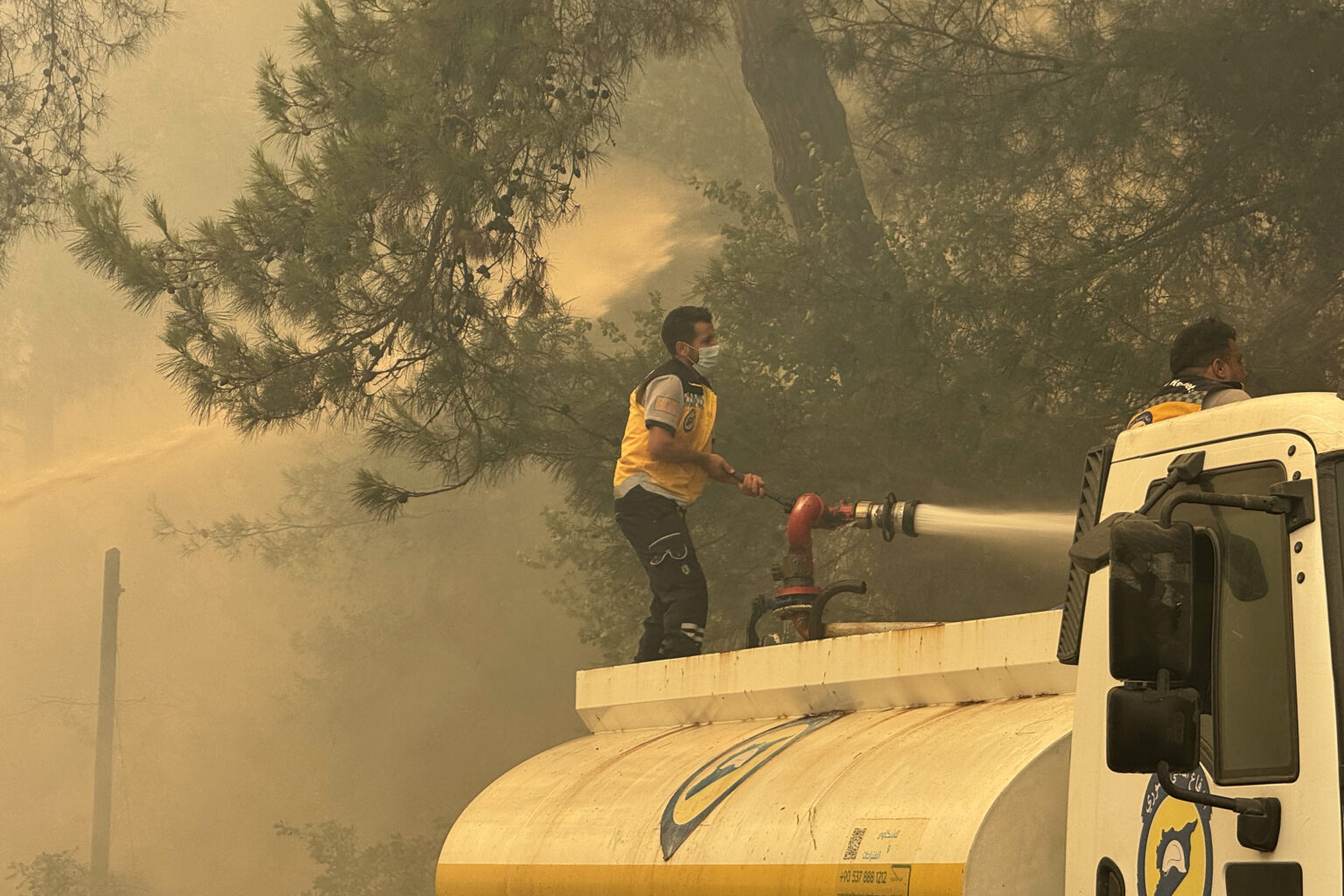ويشارك في إخماد حرائق الغابات في قرى التفاحية والروضة والميدان بناحية قسطل معاف، وفي محيط بلدة الربيعة وزنزف بريف اللاذقية، 62 فريق إطفاء من الدفاع المدني السوري وأفواج الغطاء الحراجي.
