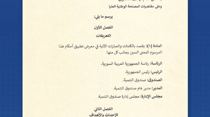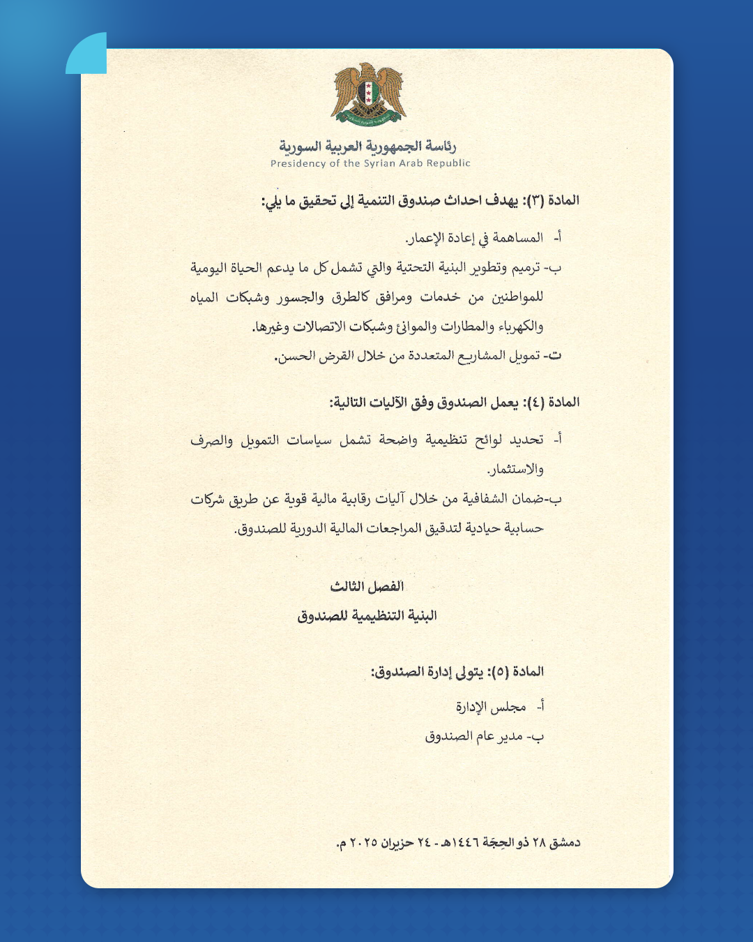 ووفق "سانا"، يهدف إحداث الصندوق إلى المساهمة في إعادة الإعمار وترميم وتطوير البنية التحتية والتي تشمل كل ما يدعم الحياة اليومية للمواطنين من خدمات ومرافق كالطرق والجسور وشبكات المياه والكهرباء والمطارات والموانئ وشبكات الاتصالات وغيرها وتمويل المشاريع المتعددة من خلال القرض الحسن.