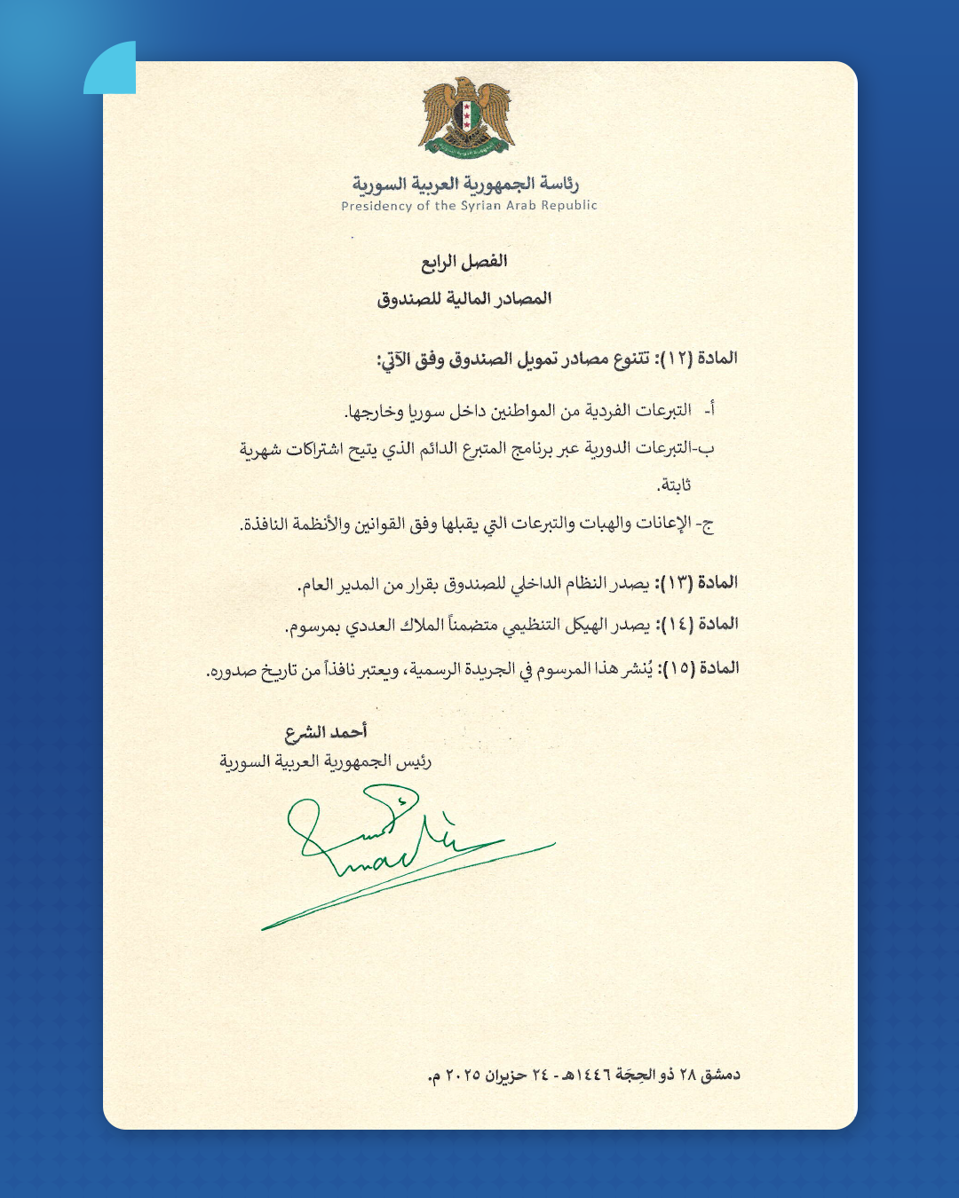 وتنص المادة 12 من المرسوم، على أن المصادر المالية للصندوق ستتنوع بين التبرعات الفردية من المواطنين داخل وخارج سوريا، وبين التبرعات الدورية عبر برنامج المتبرع الدائم الذي يتيح اشتراكات شهرية، وبين الإعانات والهبات والتبرعات التي يقبلها وفق القوانين والأنظمة النافذة.