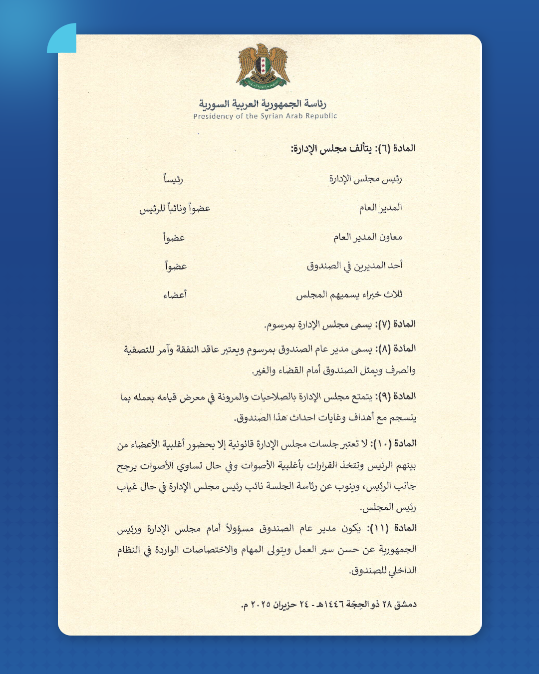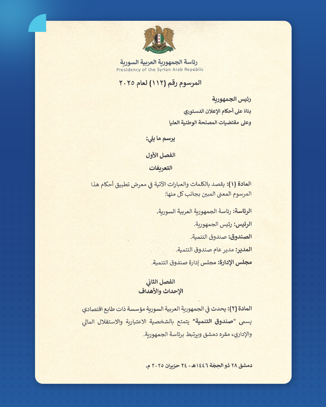 أصدر الرئيس أحمد الشرع المرسوم رقم (112) لعام 2025 القاضي بإحداث مؤسسة ذات طابع اقتصادي في الجمهورية العربية السورية تسمى صندوق التنمية يتمتع بالشخصية الاعتبارية والاستقلال المالي والإداري، مقره دمشق ويرتبط برئاسة الجمهورية.